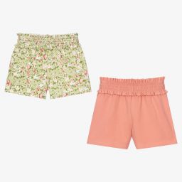 Pack of two turquoise blue and pink fruit print shorts for girls by Mayoral. Made with soft cotton jersey, both pieces have a stretchy, ruched waistband with frilled trims. The blue, pink and yellow shorts have a fun fruit print.