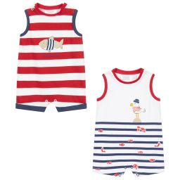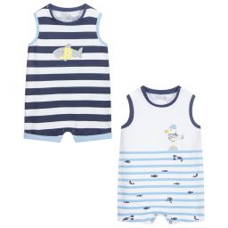 Cute pack of two shorties for baby boys and girls by Mayoral Newborn. They are made in striped blue and white cotton jersey. Both have seaside inspired prints on the front, with ribbed trims.