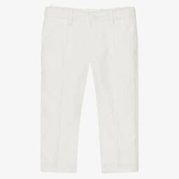 Boys blue tailoring chino trousers by Mayoral offer a refined, classic look for younger boys. Crafted from a blend of cotton and linen, these lightweight, woven trousers showcase a subtle two-tone effect with fine white threading. Featuring slanted front pockets, pintuck detailing, and an adjustable waistband for enhanced comfort, they ensure a perfect fit. Ideal for a smart casual outing, these chinos are available in limited quantities, so it's the last chance to buy.