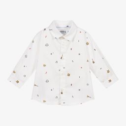 Younger boys pale blue shirt by Mayoral, with red and blue scooter prints. It is made from soft and lightweight sustainable cotton.