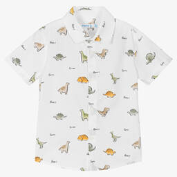 Classic blue striped shirt for little boys by Spanish brand Mayoral, with a summery palm tree and sunset print. Made in soft breathable cotton poplin, this short-sleeved shirt has a pointed collar and button fastenings on the front.