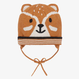 Warm and cosy grey hat for little boys by Mayoral, with cute fox features. It is knitted in a soft cotton and wool blend, with sweet little ears on top. There is a striped turned up brim, with knitted ties to secure under the chin,.