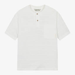 Boys khaki green cotton T-shirt is a stylish addition by Mayoral Nukutavake. Crafted from soft jersey with striped stitch detailing, it features a collarless design and button fastenings on the front. The chest patch pocket adds a casual, relaxed touch. Limited quantities available, so don't miss this last chance to buy.