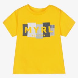 Little boys lime green sustainable cotton T-shirt by Mayoral, with a blue striped logo printed on the front and popper fastenings on the shoulder.