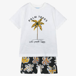 Boys white and blue cotton set by Mayoral offers a delightful blend of comfort and style, perfect for adventurous days. The soft jersey T-shirt showcases a vibrant surfboard motif, while the lightweight sweatshirt jersey shorts feature a coordinating surfboard pattern. Designed with a practical elasticated drawstring waist and three pockets, this set ensures ease of movement and functionality. Ideal for spring and summer outings, limited quantities are available for this playful ensemble.