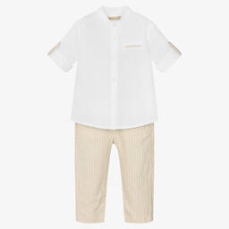 Boys navy blue trouser set by Mayoral combines smart-casual style with comfort. The white collarless shirt features a faux chest pocket with a navy blue striped trim, button fastenings, and roll-up tabs on the sleeves. The navy blue chino trousers, striped in white, have an adjustable waist with a drawstring and button fastening, along with jetted front pockets and a back pocket. Limited quantities available, perfect for spring and summer outings.