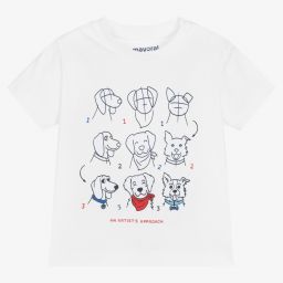 Little boys neon green T-shirt by Mayoral, made in soft and stretchy cotton jersey. It has a print of an artist's approach to drawing cartoon dogs on the front, in navy blue and green. There are useful popper fastenings on one shoulder.