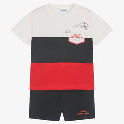 Orange and navy blue sustainable cotton shorts set for boys by Spanish brand Mayoral. It is made in comfortable jersey for all-day wear and has an adventure theme. The ivory, navy blue and orange striped T-shirt has a fun dinosaur print behind the chest pocket. The navy blue shorts have a drawstring waist for a good fit, with useful concealed side pockets and a back pocket. Easy to wear, the set just pulls on.