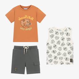 Boys red and blue cotton shorts set by Mayoral offers comfortable wear with its soft cotton jersey fabric. Featuring a crew neck, the short-sleeved T-shirt displays a wild cat print with the slogan 'The Jaguar's Roar'. The sleeveless off-white vest is adorned with a blue wild cat pattern, perfect for mix and matching. The drawstring shorts include side seam pockets and a flap pocket, embellished with a jungle-themed patch. Limited quantities available.