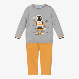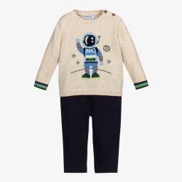 Two piece trousers set for little boys by Mayoral. The navy blue and beige sweater is knitted in a soft cotton and wool blend, with a bicycle motif on one side. The red chino trousers are made in soft cotton twill and have an adjustable waistband.