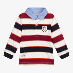 Younger boys long sleeved polo shirt by Mayoral, striped in yellow, ivory, green and blue. Made in soft cotton jersey, it has a blue Oxford collar and logo patches on the front.