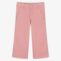 Beige wide leg trousers for girls by Mayoral are crafted from soft, slightly stretchy cotton twill, offering both comfort and style. These trousers feature an adjustable waistband with a shiny gold button, ensuring a perfect fit for growing children. The wide leg design adds a touch of trendiness, making them ideal for casual outings. Limited quantities available, so don't miss the chance to add these versatile trousers to a spring or summer wardrobe.
