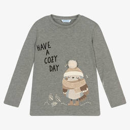 Beige top for girls by Mayoral. Super soft and stretchy, it is made in cotton jersey with a grey and beige 'Wild' appliqué, in embroidery, sequins and prints. There is a cute owl motif with a fluffy pom-pom.