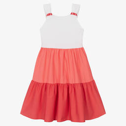 From Mayoral, a cotton blend dress for girls, with a white bodice and a gathered tiered skirt in shades of beige and black. Soft and lightweight, the dress is elasticated at the back for comfort and the shoulder straps are gathered at the front with pretty tassel fringing. The dress fastens easily with a concealed side zip.