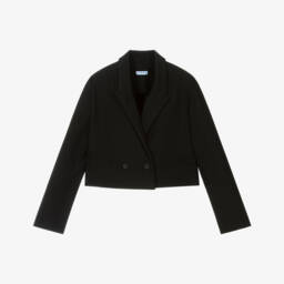 This cropped black blazer for teen girls by Mayoral combines a chic look with comfort. It is made in a soft viscose blend, with a full lining and two faux front pockets. Fastening with a single button, it is ideal for layering over dresses for a smart occasion.
