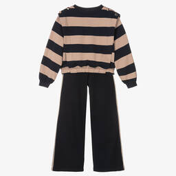 Stylishly casual, a black and ivory cotton trouser set for girls by Mayoral, made in comfortable jersey. The striped top has epaulette trims that extend down to the waist on both the front and back, with decorative golden buttons on both shoulders and an elasticated hem. The black, wide-leg, track-style trousers have black and shimmery beige striped trims on the sides for a little sparkle.