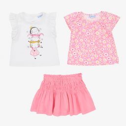 Little girls pretty tops and skirt set from Mayoral, made in soft and stretchy cotton jersey. The set includes a white sleeveless top with a cute print of girls and ruffled trims, a red floral print top with a gently elasticated neckline and a navy blue pull-on skirt with a lovely shirred detail around the waist.