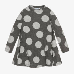 Navy blue dress for girls by Mayoral. Super soft and stretchy, this trapeze-style dress is made in mid-weight brushed jersey with jacquard polka dots in pale grey and has long sleeves for added warmth. There are front patch pockets with stylish exposed zip detailing.