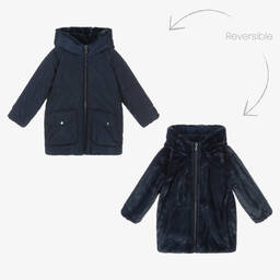 Lovely cornflower blue coat for girls by Mayoral. Fully reversible and lightly padded, one side is made in smooth polyester with front patch pockets. The reverse side is made in super soft and snuggly faux fur with side seam pockets, ideal for switching up your child's look.