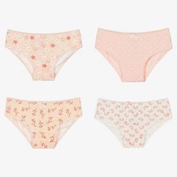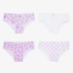A pack of four pairs of knickers for girls by Mayoral, made with soft and stretchy cotton jersey. In shades of blue, white and pink, they each have a different pattern of frogs, flamingos, stars and hearts. They all have sweet picot lace and satin ribbon trims.