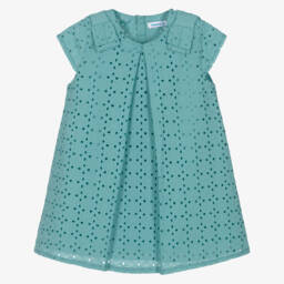 Girls pink dress with embroidered floral cutwork is a delightful choice by Mayoral, offering elegance for special occasions. Crafted from lightweight cotton, it features charming fixed bows on the shoulders and dainty capped sleeves. The dress includes a stylish inverted pleat at the front and a concealed zip fastening at the back for ease of wear. Its above-the-knee length makes it perfect for spring and summer outings. Limited quantities available, secure this exquisite piece today.