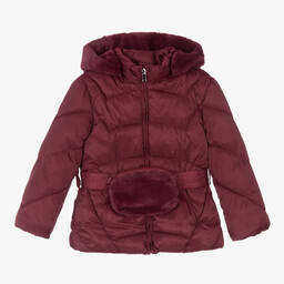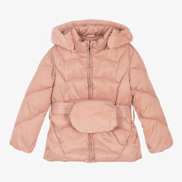 Sage green puffer coat for girls by Mayoral, with faux fur trim on the detachable hood. Made in silky smooth polyester, it has lightweight padding, a cosy fleece lining, and elasticated cuffs to keep the warmth in. It fastens with a zip and has useful concealed, zip-fastening pockets. A detachable, velco-fastening belt with a faux fur belt bag completes the look. Contains recycled fibres.