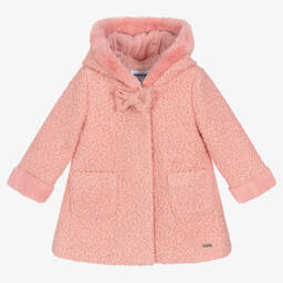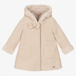 Adorable green coat for little girls, by Mayoral, made in soft and cosy bouclé. It has a sweet bow appliqué on the front, cosy plush trims, and a button fastening on the front for easy dressing.