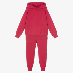 Grey tracksuit for girls by Mayoral, made in a soft, fine knit. The hoodie has cable knit raglan sleeves, a front pouch pocket and a silver logo plate on the ribbed hem. The joggers have front patch pockets and a faux drawstring on the comfortable elasticated waist.