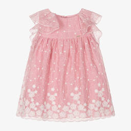 A pretty ivory floral embroidery dress for girls by Mayoral, softly woven and beautifully embroidered with tonal flowers. Ideal for a special occasion, this sleeveless design features sheer ruffle trims over the shoulder and a metal logo charm on the front. The dress is comfortably lined with two layers of lightweight cotton and fastens at the back with pearlescent buttons. Limited quantities available, last chance to buy.