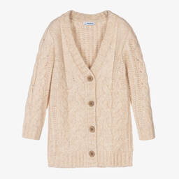 Rose pink longline cardigan for girls by Mayoral, made in a soft knit weave. Comfortable to wear, this classic v-neck cardigan has a traditional cable knit and deep ribbed trims. Containing recycled fibers, this cardigan has light brown button fastenings on the front.