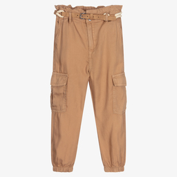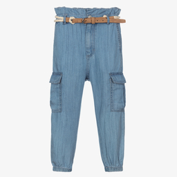 Girls pink chambray cargo trousers by Mayoral. Made with soft, lightweight Tencel™Lyocell, they have an adjustable, elasticated waist, patch pockets and elasticated cuffs. They come with a detachable beige rope belt that fastens with a silver buckle.
