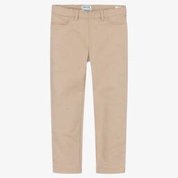 Dusky-pink trousers for girls from Mayoral, in a slim fit. They are made in soft, stretchy and medium-weight cotton for comfortable wear. They have faux front pockets, golden rhinestone studs scattered across the front, and a metal logo and embroidered heart details on the back pockets. The waist is adjustable with inner buttons for the ideal fit.