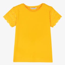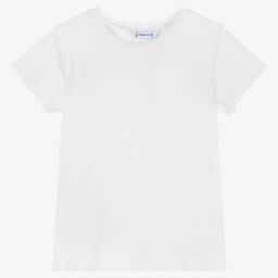 Girls dusky pink T-shirt by Mayoral, made in comfortable, sustainable cotton jersey. The shoulders and sleeves are trimmed with pretty broderie anglaise.