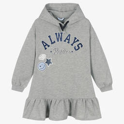 Pink hooded sweatshirt dress for girls by Mayoral, with a varsity-style appliqué on the front in dark red and gold. Made in super-comfortable polycotton with an extra soft, fleecy inside, it is ideal for all-day, relaxed wear. It has a hood and ribbed cuffs for extra cosiness and a gathered hemline.