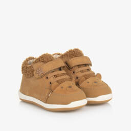 Girls pink leather walking shoes by Mayoral, crafted from soft suede with a delightful faux fur trim and an adorable bear design on the toe. The shoes feature a soft leather lining and removable ergonomic insoles for comfort. A reinforced heel and toe offer support, while the non-slip rubber sole provides stability for early walkers. Easy slip-on with elasticated laces and a secure Velcro strap. Limited quantities available, great choice for making those first steps memorable.
