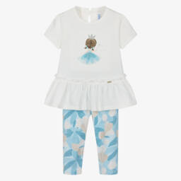 Girls pink legging ensemble by Mayoral features a charming top and leggings set. The top showcases a playful print of three adorable characters, embellished with delicate ruffles at the hem. The coordinating leggings are patterned with a sweet floral design, adding a touch of elegance. Perfect for spring and summer outings, this outfit offers both comfort and style. Limited quantities available, so secure this delightful set for your little one today.