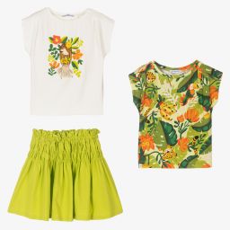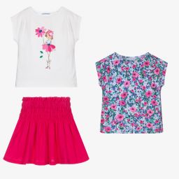 A white T-shirt and blue skirt set for girls by Mayoral, made in soft and stretchy cotton jersey. The turquoise blue skirt has an elasticated waistband with shirring detail. One of the T-shirts has a blue, pink and green floral print, while the white one has the print of a girl with pretty flower details.