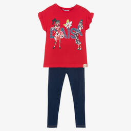 Casual and comfortable, this white and blue leggings set for girls by Mayoral is made with soft cotton jersey. Slightly longer with little frilled sleeves, the white T-shirt has a girly design in beige and blue with daisies, denim prints, brass stud detailing, and a daisy print tab on the hem. A pair of light blue, denim-look jersey leggings complete this lovely outfit.
