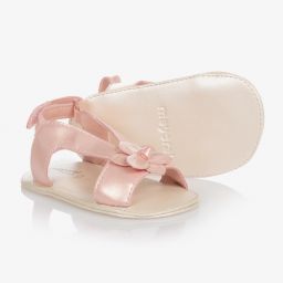 Cute gold pre-walker sandals for baby girls, by Mayoral Newborn. Made in soft faux leather, these sandals have a sweet gold flower appliqué on the front, and velcro fastening straps on the back.