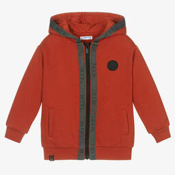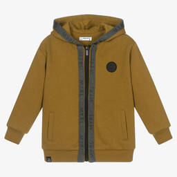 Olive green hooded zip-up top for boys by Mayoral, made in comfortable cotton-blend jersey with a soft brushed feel inside. It has a black rubberised logo patch on the chest and branded grey trims. There are front pockets and an embroidered tab on the ribbed hem, for an added branded touch.