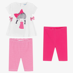 Three-piece T-shirt and leggings set for girls by Mayoral, made in soft and stretchy cotton jersey. The ivory T-shirt has a sweet print of the word 'Fabulous' with fixed black and white gingham bow trims. Both pairs of cropped leggings have a comfortable stretchy waist. One is has a gingham print and the other has a slogan print.