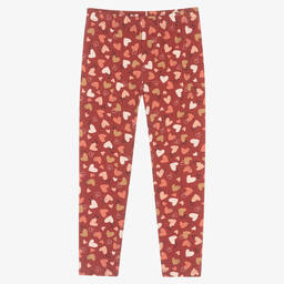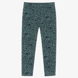 Navy blue sustainable cotton leggings for girls by Mayoral, made with soft and stretchy jersey. These comfortable bottoms have an elasticated waist and a lovely little cat pattern in mint green.