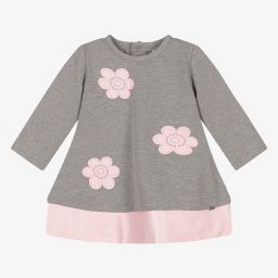 Little girls navy blue jersey dress by Mayoral, with embroidered floral faux leather appliqués. The hem is trimmed in faux leather and there are button fastenings on the back.