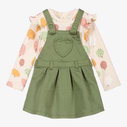 Blue pinafore dress set for baby girls, by Mayoral Newborn. Made from soft cotton jersey, the pink top has a dark pink star print with ruffle shoulder trims. It comes with a blue pinafore dress with rose gold logo embossed buttons, and an adorable brown embroidered bib on the front.