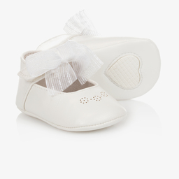 Baby girls pink pearl pre-walkers by Mayoral. Made in smooth faux leather, they have a chiffon bow decorating the velcro strap, a textile lining and smooth outer sole.