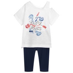 Pink top and leggings set for girls by Mayoral, made in soft and stretchy cotton jersey. The top has a cut out shoulder on one side and a colourful nail varnish print on the front with silver glitter and diamanté stud details. The leggings are cropped and have a blue, yellow, white and black animal print all over with a gently elasticated waistband.