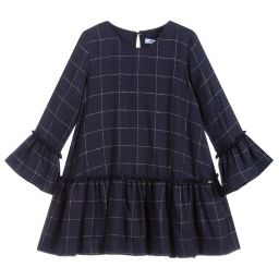 Girls pink and silver check dress from Mayoral. It is made in a soft viscose blend with a stretchy jersey lining. There are stylish frilled cuffs and hem, with keyhole button fastening on the back.