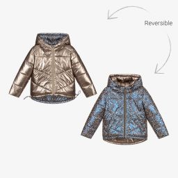 Girls shiny fuchsia pink and silver reversible padded puffer coat by Mayoral, made in soft polyamide. One side is plain shiny silver with a zip fastening and two side pockets. The other side is plain fuchsia pink and also has two pockets.