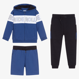 Bright red and navy blue three piece tracksuit for boys by Mayoral, made in mid-weight cotton jersey. The hooded zip-up top has a white panel across the front, with 'Ride' & 'Roll' in red and blue letters. Both the shorts and joggers have an adjustable drawstring waist and three pockets.