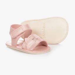 Sweet shimmery silver pre-walker sandals for baby girls, by Mayoral Newborn. Made in soft faux leather, they have cute cat face on the front strap with 3D ears, and a velcro strap fastening around the ankle for a secure fit.